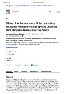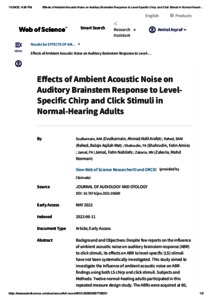 Dzulkarnain, Ahmad Aidil Arafat and Mat Rahed, Balqis Aqilah and Shahrudin, Fatin Amira and Jamal, Fatin Nabilah and Zakaria, Mohd Normani (2022) Effects of ambient acoustic noise on auditory brainstem response to level-specific chirp and click stimuli in normal-hearing adults. Journal of Audiology and Otology, 26 (4). pp. 182-191. ISSN 2384-1621 E-ISSN 2384-1710