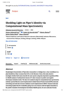 Osman, Muhamad Faris and Mohd Faudzi, Siti Munirah and Khamis, Shamsul and Sarbini, Shahrul Razid and Shaari, Khozirah (2022) Shedding light on Piper’s identity via computational mass spectrometry. Malaysian Journal of Chemistry, 24 (4). pp. 150-160. ISSN 1511-2292 E-ISSN 2550-1658