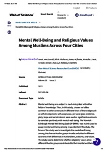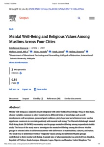 Ismail, Nik Ahmad Hisham and Tekke, Mustafa and Fatah, Ismail and Rafeeq, Shazmin (2022) Mental well-being and religious values among Muslims across four cities. Intellectual Discourse, 30 (2). pp. 371-394. ISSN 0128-4878 E-ISSN 2289-5639