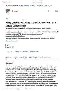 Shahadan, Siti Zuhaidah and Mohamad Ismail, Mohamad Firdaus and Kamaruzaman, Khalidah Nadhirah (2023) Sleep quality and stress levels among nurses: a single center study. Jurnal Keperawatan Indonesia, 26 (3). pp. 142-152. ISSN 1410-4490 E-ISSN 2354-9203