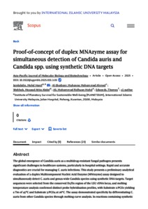 Jainlabdin, Mohd Hanif and Ahmed Al-Shaibani, Muhanna Mohammed and Abdel Wahhab, Mosaad Attia and Mohd Ali, Mohammad Ridhuan and Edwards, Thomas and Tovar-Torres, Jorge (2025) Proof-of-concept of duplex MNAzyme assay for simultaneous detection of Candida auris and Candida spp. using synthetic DNA targets. Asia-Pacific Journal of Molecular Biology and Biotechnology, 33 (3). pp. 24-30. ISSN 0128-7451 E-ISSN 2672-7277