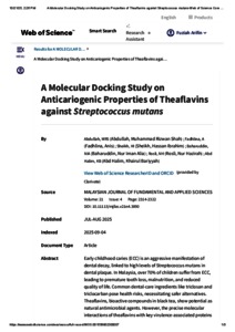 Abdullah, Muhammad Rizwan Shah and Awang, Anis Fadhlina Izyani and Sheikh Mohamed, Hassan Ibrahim and Baharuddin, Nur Iman Alia and Rosli, Nur Hazirah and Abd Halim, Khairul Bariyyah (2025) A molecular docking study on anticariogenic properties of theaflavins against Streptococcus mutans. Malaysian Journal of Fundamental and Applied Sciences, 21 (4). pp. 2314-2322. ISSN 2289-5981 E-ISSN 2289-599X