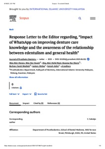 Wan Abd. Manan, Wan Nor Hayati and Abg. Abd. Mohd Rizal, Dayang Nur Sharin and Borhan, Farah Wajihah and Lestari, Widya and Ismail, Azlini and Che Musa, Muhd Firdaus and Mohd Ibrahim, Mohamad Shafiq and Yuan, Judy Chia-Chun and Sukotjo, Cortino (2025) Response letter to the editor regarding, “Impact of WhatsApp on improving denture care knowledge and the awareness of the relationship between edentulism and general health”. Journal of Prosthetic Dentistry, 134 (3). pp. 872-873. ISSN 0022-3913 E-ISSN 1097-6841