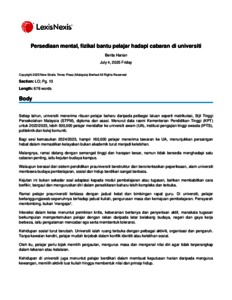 Abdul Ghani, Azril Shahreez (2025) Persediaan mental, fizikal bantu pelajar hadapi cabaran di universiti. Berita Harian, Muka Tiga Belas (4hb Julai 2025). p. 13.
