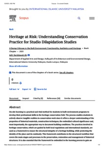 Ab Jalil, Nurlelawati (2025) Heritage at risk: understanding conservation practice for studio dilapidation studies. In: A Design Odyssey in the Built Environment: Functionality, Aesthetics and Heritage. Advances in the arts . Nova Science Publisher, Inc., New York, pp. 109-119. ISBN 979-8-89530-765-6