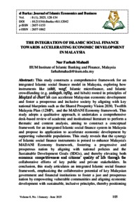 This study constructs a comprehensive framework for an integrated Islamic social finance model in Malaysia, exploring how instruments like zakāt, waqf, Islamic microfinance, and Islamic crowdfunding (e.g. ṣadaqah, infāq, and hibah) rooted in principles of Maqāṣid al-Sharīʽah can accelerate Malaysian economic development and foster a prosperous and inclusive society by aligning with key national blueprints such as the Shared Prosperity Vision 2030, Twelfth Malaysia Plan (12MP), and the MADANI Economy framework. This study adopts a qualitative approach, it undertakes a comprehensive desk-based review of academic and institutional literature to perform a thematic and content analysis, aiming to construct a conceptual framework for an integrated Islamic social finance system in Malaysia and propose its application to accelerate economic development by supporting vulnerable populations. This study reveals that the synergy of Islamic social finance instruments is poised to enhance Malaysia's MADANI Economy framework, fostering a progressive and prosperous nation by aligning with national policies and the Sustainable Development Goals (SDGs), and thereby elevating both economic competitiveness and citizens’ quality of life through the collaborative efforts of key public and private stakeholders. In conclusion, this study articulates an integrated Islamic social finance framework, emphasizing the collaborative potential of key Malaysian government and financial institutions to foster a just and prosperous nation by empowering vulnerable communities and aligning economic development with sustainable, inclusive principles, thereby positioning Malaysia as a global leader in an integrated Islamic social finance framework.