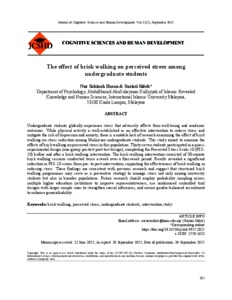 Hasan, Nur Sakinah and Sidek, Suriati (2025) The effect of brisk walking on perceived stress among undergraduate students. Journal of Cognitive Sciences & Human Development, 11 (2). pp. 201-213. ISSN 2462-1153 E-ISSN 2550-1623
