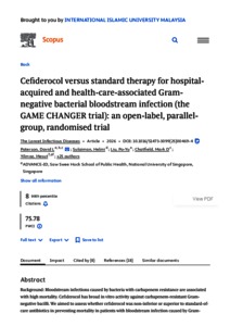 Paterson, David L and Sulaiman, Helmi and Liu, Po-Yu and Chatfield, Mark D and Yilmaz, Mesut and Salmuna, Zeti Norfidiyati and Mazlan, Mohd Zulfakar and Anunnatsiri, Siriluck and Sirijatuphat, Rujipas and Chotiprasitsakul, Darunee and Lye, David C and Somani, Jyoti and Kalimuddin, Shirin and Aslan, Abdullah T and Thamlikitkul, Visanu and Lee, Yi-Tzu and Yang, Ya-Sung and Lin, Yi-Tsung and Wan Ramli, Wan Nurliyana and Tseng, Chien-Hao and Archuleta, Sophia and Chan, Yvonne Fu Zi and Forde, Brian M and Wright, Hugh and Stewart, Adam G and Ramsay, Kay A and Ling, Weiping and Rossi, Vicki and Harris-Brown, Tiffany M and Harris, Patrick N A (2026) Cefiderocol versus standard therapy for hospital-acquired and health-care-associated Gram-negative bacterial bloodstream infection (the GAME CHANGER trial): an open-label, parallel-group, randomised trial. The Lancet Infectious Diseases, 26 (2). pp. 148-159. ISSN 1473-3099 E-ISSN 1474-4457