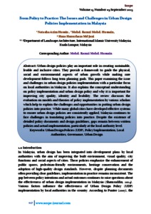 Urban design policies play an important role in creating sustainable, livable and inclusive cities. They provide a framework to guide the physical, social and environmental aspects of urban growth while making sure development follows long term planning goals. This paper examining the issue and challenges in urban design policies implementation with a particular focus on local authorities in Malaysia. It also explains the conceptual understanding on policy implementation and urban design policy and why it is important for improving city quality, identity and livability. The review discusses the evaluation on models and theories of policy implementation by various scholars which help to explain the challenges and opportunities in putting urban design policies into practice. While many global cities have developed effective systems to ensure urban design policies are consistently applied, Malaysia continues to face challenges in translating policies into practice. Despite the existence of detailed policy documents and design guidelines, gaps remain between written policies and actual implementation, particularly at the local authority level