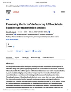 Alarood, Ala Abdulsalam and Ibrahim, Ahmed and Abubakar, Adamu and Alsulami, Abdulkream (2025) Examining the factor’s influencing IoT-blockchain based secure transmission services. Scientific Reports, 15 (1). pp. 1-18. E-ISSN 2045-2322