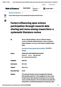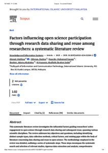 Ahmed, Mahfooz and Othman, Roslina and Noordin, Mohamad Fauzan and Ibrahim, Adamu Abubakar and Al-Hussaini, Abulfathi Ibrahim Saleh (2025) Factors influencing open science participation through research data sharing and reuse among researchers: a systematic literature review. Knowledge and Information Systems, 67 (3). pp. 2801-2853. ISSN 0219-1377 E-ISSN 0219-3116