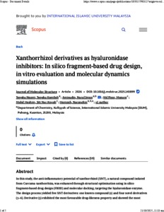 Tengku Nazmi, Tengku Kamilah and Aminudin, Nurul Iman and Md Pisar, Mazura and Mohd Hashim, Siti Nur Aisyah and Hamzah, Nurasyikin and Abd Halim, Khairul Bariyyah (2026) Xanthorrhizol derivatives as hyaluronidase inhibitors: In silico fragment-based drug design, in vitro evaluation and molecular dynamics simulations. Journal of Molecular Structure, 1349. pp. 1-11. ISSN 0022-2860 E-ISSN 1872-8014