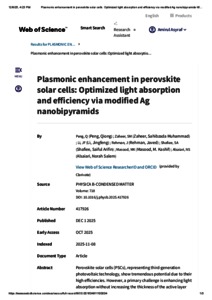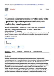 | Uncontrolled Keywords: | Perovskite solar cell (PSC), Ag NBPs, Local surface plasmon resonance (LSPR), Light absorption enhancement, Power conversion efficiency (PCE), Simulation |