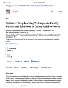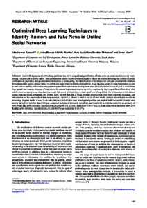 Zamani, Abu Sarwar and Hassan Abdalla Hashim, Aisha and Mohamed, Sara Saadeldeen Ibrahim and Alam, Nasre (2025) Optimized deep learning techniques to identify rumors and fake news in online social networks. Journal of Computational and Cognitive Engineering (JCCE), 4 (2). pp. 142-150. ISSN 2810-9570 E-ISSN 2810-9503