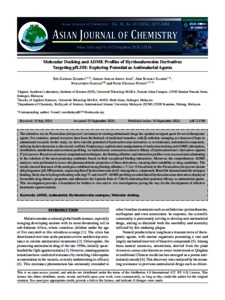 Zulkifli, Siti Zafirah and Abdul Aziz, Ahmad Amzar and Saaidin, Aimi Suhaily and Hamzah, Nurasyikin and Pungot, Noor Hidayah (2024) Molecular docking and ADME profiles of hyrtiosulawesine derivatives targeting pfLDH: exploring potential as antimalarial agents. Asian Journal of Chemistry, 36 (10). pp. 2475-2484. ISSN 0970-7077 E-ISSN 0975-427X