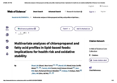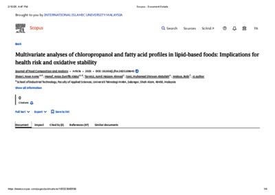 Shaari, Noor Asma and Abdul Manaf, Aniza Zuniffa and Ahmad Tarmizi, Azmil Haizam and Abdullah Sani, Muhamad Shirwan and Andoyo, Robi and Md. Sikin, Adi (2025) Multivariate analyses of chloropropanol and fatty acid profiles in lipid-based foods: Implications for health risk and oxidative stability. Journal of Food Composition and Analysis, 148 (Part 4). pp. 1-9. ISSN 0889-1575 E-ISSN 1096-0481