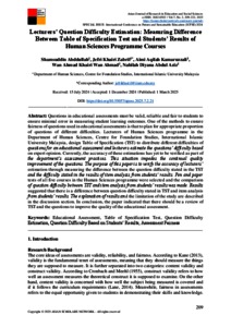 Abstract: Questions in educational assessments must be valid, reliable and fair to students to ensure minimal error in measuring student learning outcomes. One of the methods to ensure fairness of questions used in educational assessments is that to plan for appropriate proportion of questions of different difficulties. Lecturers of Human Sciences programme in the Department of Human Sciences, Centre for Foundation Studies, International Islamic University Malaysia, design Table of Specification (TST) to distribute different difficulties of questions for an educational assessment and lecturers estimate the questions’ difficulty based on expert opinion. Currently, the accuracy of these estimations has yet to be verified as part of the department’s assessment practices. This situation impedes the continual quality improvement of the questions. The purpose of this paper is to verify the accuracy of lecturers’ estimation through measuring the difference between the question difficulty stated in the TST and the difficulty stated in the results of item analysis from students’ results. Pen and paper tests of all five courses in the Human Sciences programme were selected and the comparison of question difficulty between TST and item analysis from students’ results was made. Results suggested that there is a difference between question difficulty stated in TST and item analysis from students’ results. The explanation of results and the limitation of the study are described in the discussion section. In conclusion, the paper indicated that there should be a review of TST and the questions to improve the quality of the educational assessment. Keywords: Educational Assessment, Table of Specification Test, Question Difficulty Estimation, Question Difficulty Based on Students’ Results, Assessment Fairness