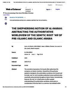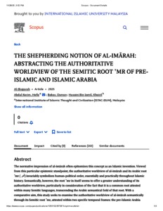 Abdul Karim, Mohd Hafiz and Bakar, Osman and Bin Jamil, Khairil Husaini (2025) The shepherding notion of al-imārah: abstracting the authoritative worldview of the Semitic root ʼmr of pre-Islamic and Islamic Arabia. Al-Shajarah: Journal of the International Institute of Islamic Thought and Civilisation, 30 (1). pp. 55-89. ISSN 1394-6870 E-ISSN 2735-1866