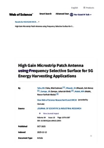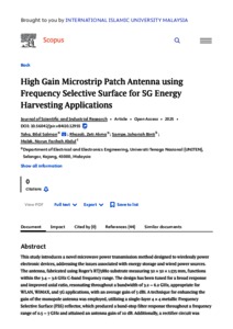 Taha, Bilal Salman and Rhazali, Zeti Akma and Sampe, Jahariah and Abdul Malek, Norun Farihah (2025) High gain microstrip patch antenna using frequency selective surface for 5G energy harvesting applications. Journal of Scientific and Industrial Research, 84 (10). pp. 1076-1087. ISSN 0022-4456 E-ISSN 0975-1084