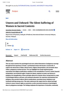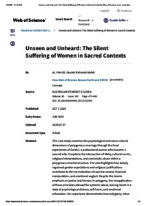 Mohd Ali, Fauzah Rahimah (2025) Unseen and unheard: the silent suffering of women in sacred contexts. Australian Feminist Studies, 40 (126). pp. 473-484. ISSN 0816-4649 E-ISSN 1465-3303