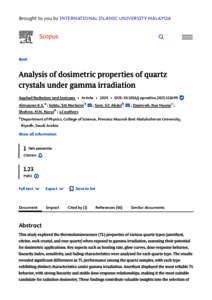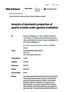 Almugren, K.S. and Sabtu, Siti Norbaini and Abdul Sani, S.F. and Dzamrah, Nur Husna and M.N., Nurul Shahira and Ahmad Shaharuddin, Siti Shafiqah and Bradley, David A. (2025) Analysis of dosimetric properties of quartz crystals under gamma irradiation. Applied Radiation and Isotopes, 218 (NA). pp. 1-12. ISSN 0969-8043 E-ISSN 1872-9800