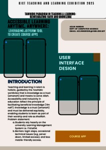 This article outlines a project from the KICT Teaching and Learning Exhibition 2025 that focuses on the "Tawhidic Paradigm in Teaching & Learning" by promoting Accessible Learning Anytime, Anywhere. The initiative addresses the barriers of relying solely on the university's Learning Management System (iTa'LeEM), such as login steps, occasional technical issues, and limited mobile-friendliness. The solution involves leveraging the JotForm tool to create a lightweight, mobile-friendly course app that provides students with quick, 24/7 access on any device to essential course materials like video lectures and slides , embodying the Islamic principle of amanah (knowledge as a trust) and ensuring equitable access to beneficial knowledge ('ilm nafi').