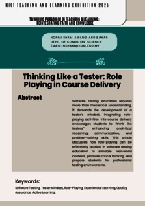 Awang Abu Bakar, Normi Sham (2025) Thinking like a tester: role playing in course delivery. Tawhidic Paradigm in Teaching Learning: Reintegrating Faith & Knowledge, 2025 (1). pp. 72-74.