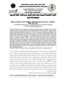 Abstract: Reading is an important skill in learning a foreign language, including Arabic. Through it, learners can obtain useful information about that language, such as vocabulary, structures, and multiple meanings, especially for learners of Arabic as a second language in Southeast Asia, because obtaining language competencies can only be achieved through repeated reading; but unfortunately, additional books to improve reading skills are very few, and this leads to their weak desire to learn the Arabic language. As for teachers, they are unable to find an interactive approach to increase learners' ability to comprehend what they read. There are two types of reading as defined by Harmer (2007) in one of her studies: Extensive reading and intensive reading. Extensive Reading takes place outside the classroom and includes short stories, novels, web pages, magazines, newspapers, or other reference materials. The purpose of employing it with learners is to train them to read directly and fluently without assistance from others. Ideally, reading for pleasure. The research aims to reveal the interaction of extended reading to develop the reading comprehension skill of Arabic as a second language students. The researcher found that extended reading is very useful in developing the reading comprehension skill of Arabic as a second language students.