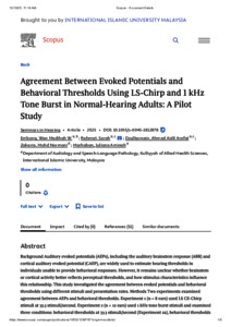 W. Embong, Wan Madihah and Rahmat, Sarah and Dzulkarnain, Ahmad Aidil Arafat and Zakaria, Mohd Normani and Marhaban, Juliana Aminah (2025) Agreement between evoked potentials and behavioral thresholds using LS-Chirp and 1 kHz tone burst in normal-hearing adults: a pilot study. Seminar in Hearing, 46 (4). pp. 253-265. ISSN 0734-0451 E-ISSN 1098-8955