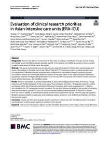 Li, Andrew and Nasa, Prashant and Myatra, Sheila Nainan and Shrestha, Gentle Sunder and Al-Fares, Abdulrahman and Chan, Ming-Cheng and Cho, Young-Jae and Egi, Moritoki and Faruq, Mohammad Omar and Harmouche, Carine and Hashemian, Seyed Mohammad Reza and Kharaba, Ayman and Konkayev, Aidos and Muchtar, Faisal and Nafees, Khalid Mahmood Khan and Naranpurev, Mendsaikhan and Son, Do Ngoc and Ng, Pauline Yeung and Mat Nor, Mohd Basri and Palo, Jose Emmanuel and Uyar, Mehmet and Zhang, Zhongheng and Divatia, Jigeeshu and Phua, Jason and M. Arabi, Yaseen and Ling, Lowell (2025) Evaluation of clinical research priorities in Asian intensive care units (ERA‑ICU). Journal of Intensive Care, 13 (1). pp. 1-10. E-ISSN 2052-0492