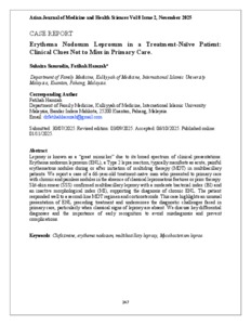 Samsudin, Suhaiza and Hamzah, Fatihah (2025) Erythema nodosum leprosum in a treatment-naïve patient: clinical clues not to miss in primary care. Asian Journal of Medicine and Health Sciences, 8 (2). pp. 247-253. E-ISSN 2637-0603