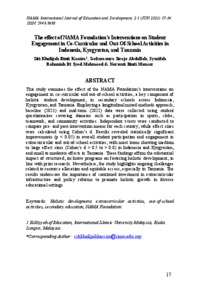 Kassim, Siti Kholijah and Ssekamanya, Siraje Abdallah and Syed Mahmood, Syarifah Rohaniah and Mansor, Norwati (2025) The effect of NAMA Foundation’s interventions on student engagement in co-curricular and out-of-school activities in Indonesia, Kyrgyzstan, and Tanzania. NAMA International Journal of Education and Development, 2 (1). pp. 17-34. ISSN 2948-3638