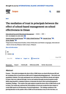 Hussein Amzat, Ismail and Alabri, Khalaf Marhoun and Hamad, Omer and Al-Ani, Wajeha Thabet Khadem (2025) The mediation of trust in principals between the effect of school-based management on school effectiveness in Oman. International Journal of Educational Management, 39 (5). pp. 1366-1388. ISSN 0951-354X E-ISSN 1758-6518