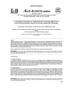 Adnan, Ezwati and Othman, Azam and Amzat, Ismail Hussein and Miraz, Mahadi Hasan (2025) A conceptual framework on organisational citizenship behaviour in educational institutions based on servant leadership philosophy. Enviroment Behavour proceeding journals, 2025 (13th Asia-Pacific International Conference on Environment-Behaviour Studies). pp. 359-365. E-ISSN 2398-4287