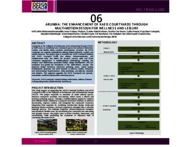 Abdul Rahman, Julaila and Muhammad Aminuddin, Arif Salihin and Che Haron, Roziha and Hamat, Sufian and Raja Abdul Rahman, Raja Intan Suhaylah and Sofyan, Amar Firdaus and Ayob, Mohd Fairullazi and Che Abdullah, Siti Noorfairus and Alias, Nur Ulfah Awatif Umairah and Abdul Majid, Masidah and Abdul Rahim, Asiah (2025) Arunika: the enhancement of KAED courtyards through multi-motion design for wellness and leisure. Design Ideals Journal, 7 (2). pp. 53-62. E-ISSN 2735-1785