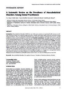 Mohd Amir, Nur Aisyah and Norazam, Nurun Nadihah and Ahmad, Norfaezah and Ahmad, Norhidayah (2025) A systematic review on the prevalence of musculoskeletal disorders among dental practitioners. Malaysian Journal of Medicine and Health Sciences, 21 (6). pp. 1-10. ISSN 1675-8544 E-ISSN 2636-9346