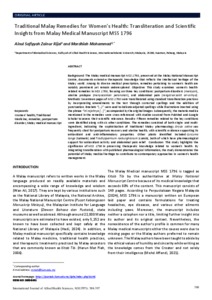Background: The Malay medical manuscript MSS 1796, preserved at the Malay National Manuscript Centre, documents extensive therapeutic knowledge that reflects the intellectual heritage of the Malay world. Among its diverse medical prescription, remedies pertaining to women’s health are notably prominent yet remain underexplored. Objective: This study examines women’s healthrelated remedies in MSS 1796, focusing on three key conditions: postpartum disorders (meroyan), uterine prolapse (menyacakkan peranakan), and abdominal pain (rengat or sakit ari-arinya). Methods: Seventeen pages of MSS 1796 were transliterated using standard transliteration practices by incorporating amendments to the text through corrected spellings and the addition of punctuation. Brackets “(…)” were used to indicate adjusted spellings while illustrations inserted using the phrase “ini rajahnya […]”, accompanied by the original images. Subsequently, the materia medica mentioned in the remedies were cross-referenced with studies sourced from PubMed and Google Scholar to assess their scientific relevance. Results: Fifteen remedies related to the key conditions were identified along with six other conditions. The remedies consisted of both single- and multiingredient, indicating the sophistication of traditional Malay pharmacology. Oryza sativa was frequently cited for postpartum recovery and uterine health, with scientific evidence supporting its antioxidant and anti-inflammatory properties. Other plants identified included Curcuma longa (turmeric) and Trachyspermum roxburghianum (cumin), both of which have pharmacological support for antioxidant activity and abdominal pain relief. Conclusion: This study highlights the significance of MSS 1796 in preserving therapeutic knowledge related to women’s health. By integrating transliteration with published pharmacological information, the study demonstrates the potential of Malay medical heritage to contribute to contemporary approaches in women’s health management.