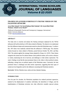 The study aims to examine and analyse the framing techniques employed by the TikTok influencer @YourFavoriteGuy in 100 videos related to Palestine. The objective is to understand how this influencer shapes and communicates narratives about the Palestinian cause. To achieve this, 100 videos were randomly selected from the influencer’s TikTok page. The selection criteria focused on videos related to Palestine, posted between October 7th, 2021, and May 2024. The analysis applied the message frames adopted by Xiong et al. (2019). These frames categorize the content into five distinct themes: direct political content, call to action, reference to victims, mentioning the role of activists, and challenges or other artistic expressions. The study’s findings reveal that the most prominent frame in the videos is direct political content, indicating a strong focus on political aspects of the Palestinian cause. Conversely, the least prominent frame is challenges and other artistic expressions, suggesting that these types of content are less frequently used by the influencer concerning the Palestinian narrative.