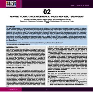 The paper explores the idea and concept of Islamic civilisation and the Islamic Garden, and their implementation in landscape architectural design in the Malaysian context. This project explores how the Islamic Garden design concept can be integrated within landscape design for a diverse society without neglecting the local culture, values, and place identity. Deeply rooted in the symbolic, cultural, and theological foundations of Islamic civilisation, Islamic Gardens have historically represented more than aesthetic beauty. They embody spiritual meaning, philosophical depth, and a connection to nature and divine creation. With origins dating back to the 7th century through the Persian Garden, Islamic Gardens evolved across regions and cultures, adapting to local environmental and social contexts. However, modern landscape practices often overlook these traditional elements. This project investigates how Islamic Garden principles can be revitalised and implemented in contemporary landscape design, particularly in public park and spaces in Pulau Wan Man, Terengganu. The project embeds cultural identity, religious values, and environmental planning that co-exist in the design of landscape spaces. Ultimately, the study emphasises the importance of preserving Islamic heritage through landscape design that reflects both traditional principles and modern needs, ensuring the enduring relevance of Islamic Gardens in diverse urban and cultural contexts
