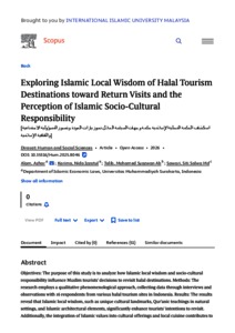 Alam, Azhar and Karima, Nida Izzatul and Ab Talib, Mohamed Syazwan and Md Sawari, Siti Salwa (2026) Exploring Islamic local wisdom of halal tourism destinations toward return visits ‎and the perception of Islamic socio-cultural responsibility = استكشاف الحكمة المحلية الإسلامية حكمة وجهات السياحة الحلال نحوزيارات العودة وتصورالمسؤولية الاجتماعية والثقافية الإسلامية. Dirasat: Human and Social Sciences, 53 (2). pp. 1-11. ISSN 1026-3721 E-ISSN 2663-6190