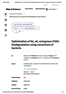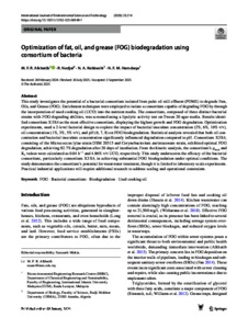 Al-Khatib, Ma'an Fahmi Rashid and Nedjai, Radhia and Kabbashi, Nassereldeen Ahmed and Hamdaqa, Nevin F. M. (2026) Optimization of fat, oil, and grease (FOG) biodegradation using consortium of bacteria. International Journal of Environmental Science and Technology, 23 (214). pp. 1-12. ISSN 1735-1472 E-ISSN 1735-2630
