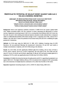 Ismail, Azlini and Ismail, Che Muhammad Khairul Hisyam and Abdul Hamid, Azzmer Azzar and Mohd Abdul Razak, Mohd Ridzuan and Mokhtar@Makhtar, Khairani Idah and Mustafa Al-Ahmad, Basma Ezzat and Lestari, Widya (2025) Prophylactic potential of kelulut honey against SARS-CoV-2 via ACE-2 binding inhibition. In: UNSPECIFIED.