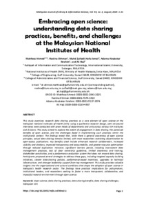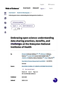 Mahfooz, Ahmed and Othman, Roslina and Ismail, Muhd Zulfadli Hafiz and Ibrahim, Adamu Abubakar and Haji, Ali (2025) Embracing open science: understanding data sharing practices, benefits, and challenges at the Malaysian National Institutes of Health. Malaysian Journal of Library & Information Science, 30 (2). pp. 1-21. ISSN 1394-6234