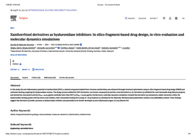 | Uncontrolled Keywords: | Xanthorrhizol Fragment-based drug design, Hyaluronidase, Optimisation, Molecular dynamics, ADME |