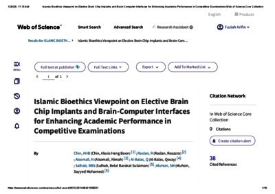 Chin, Alexis Heng Boon and Roslan, Rosazra and Alsomali, Nimah and Al‑Balas, Qosay and Salhab, Belal Barakat Sulaiman and Muhsin, Sayyed Mohamed (2026) Islamic bioethics viewpoint on elective brain chip implants and brain computer interfaces for enhancing academic performance in competitive examinations. Asian Bioethics Review, 18 (NA). pp. 79-92. ISSN 1793-8759 E-ISSN 1793-9453