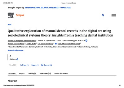 Azman, Syuwari Azhar and Abidin, Sulhi and Lin, Galvin Sim Siang and Muhamad Halil, Mohd Haikal (2026) Qualitative exploration of manual dental records in the digital era using sociotechnical systems theory: insights from a teaching dental institution. Journal of Yeungnam Medical Science, 43 (NA). pp. 1-8. E-ISSN 2799-8010