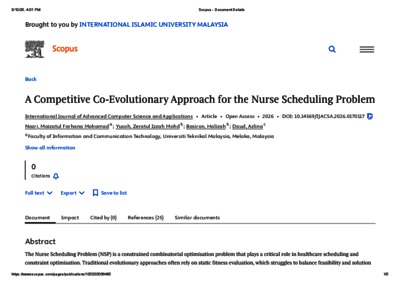 Mohamad Nazri, Maizatul Farhana and Mohd Yusoh, Zeratul Izzah and Basiron, Halizah and Daud, Azlina (2026) A competitive co-evolutionary approach for the nurse scheduling problem. International Journal of Advanced Computer Science and Applications, 17 (1). pp. 177-186. ISSN 2158-107X E-ISSN 2156-5570