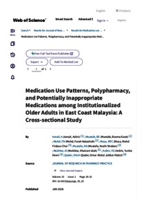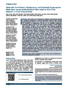 Ismail, Azlini and Mustafa Al-Ahmad, Basma Ezzat and Mohd, Farah Natashah and Che Musa, Muhd Firdaus and Mustafa, Nazih Shaban and Mokhtar@Makhtar, Khairani Idah and Ardini, Yunita Dewi and Abdul Qader, Omar Abdul Jabbar (2026) Medication use patterns, polypharmacy, and potentially inappropriate medications among institutionalized older adults in East Coast Malaysia: a cross‑sectional study. Journal of Research in Pharmacy Practice, 15 (1). pp. 26-32. ISSN 2319-9644 E-ISSN 2279-042X