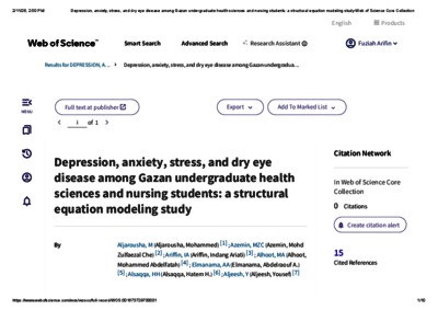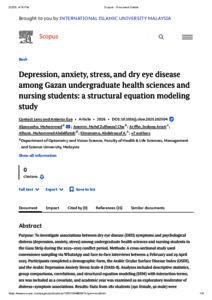 Aljarousha, Mohammed and Che Azemin, Mohd Zulfaezal and Ariffin, Indang Ariati and Alhoot, Mohammed Abdelfatah and Elmanama, Abdelraouf A. and Alsaqqa, Hatem H. and Aljeesh, Yousef and Awg Isa, Mohd Zaki and Ang, Mia Yang and Alghamdi, Waleed M. and Ahmad Mizher, Hussam Abdeljabar and Shaqoura, Emad I.H. (2026) Depression, anxiety, stress, and dry eye disease among Gazan undergraduate health sciences and nursing students: a structural equation modeling study. Contact Lens and Anterior Eye, 49 (1). pp. 1-6. ISSN 1367-0484