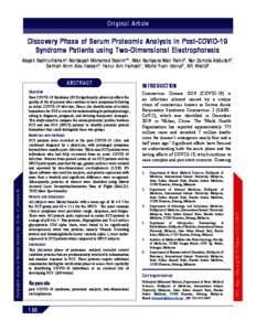 Badrulhisham, Aisyah and Mohamed Bakrim, Norbaiyah and Wan Ramli, Wan Nurliyana and Abdullah, Nor Zamzila and Abu Hassan, Salmah Anim and Hamzah, Hairul Aini and Idorus, Mohd Yusri and Khatib, Alfi (2026) Discovery phase of serum proteomic analysis in post-COVID-19 syndrome patients using two-dimensional electrophoresis. Bangladesh Journal of Medical Science, 25 (1). pp. 196-205. ISSN 2223-4721 E-ISSN 2076-0299